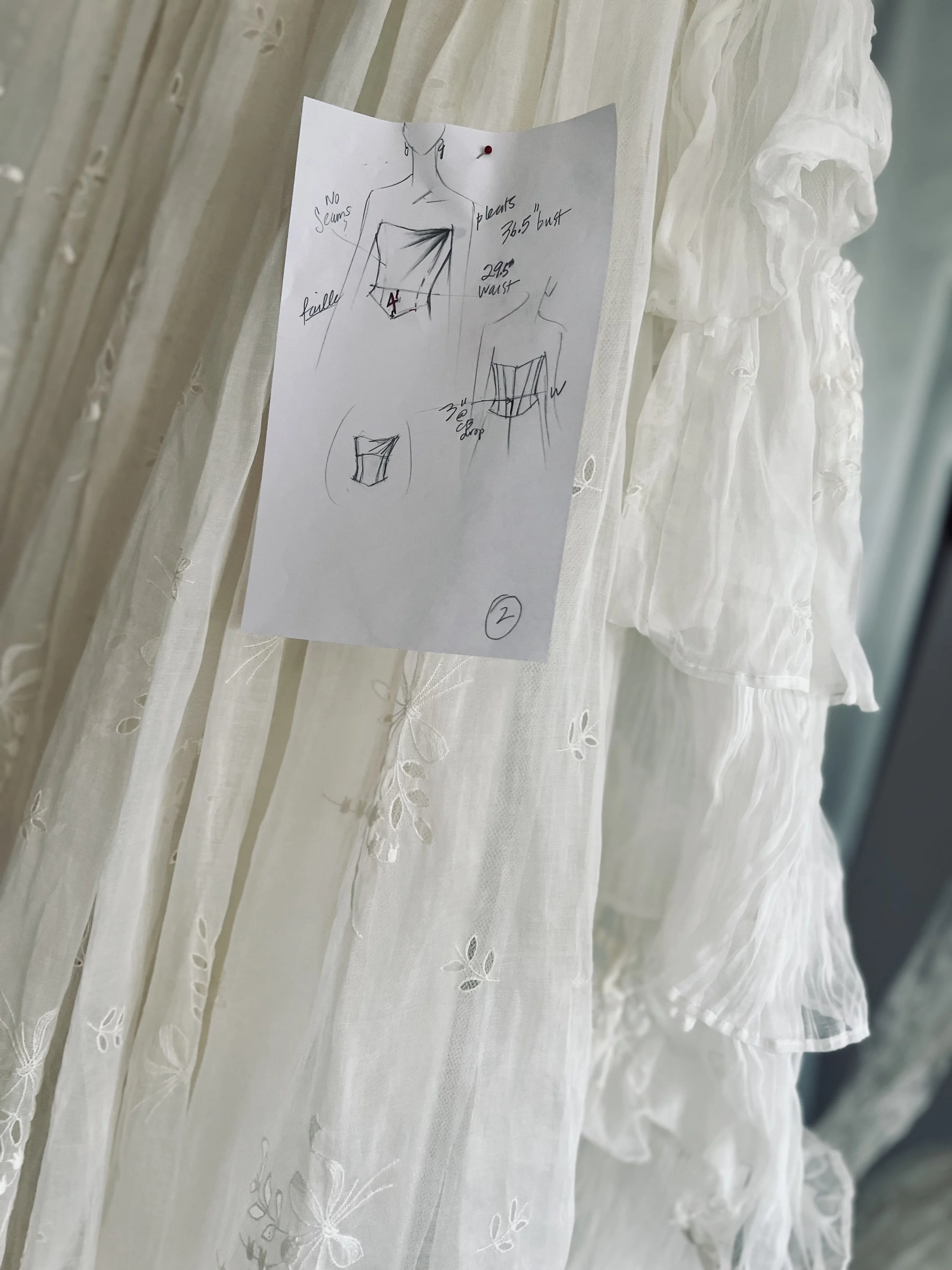 When you bring your heirloom to Maybelle, it is placed in the hands of our master artisans. Our expert drapers, pattern makers, and sewists work under meticulous creative direction to ensure your vision is executed with couture-level precision. Whether we are constructing a modern bustier, drafting an architectural bodice, or thoughtfully repositioning heritage lace, every stitch is made with the utmost reverence for the original textile.